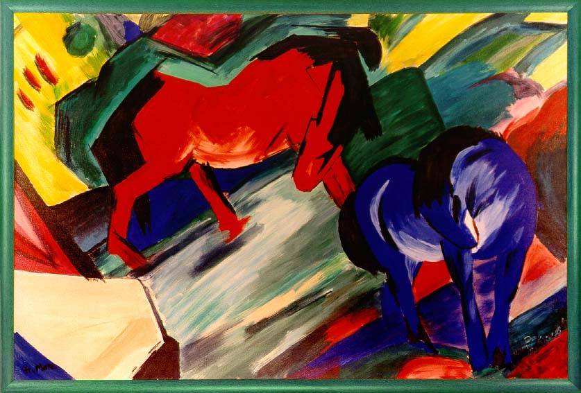 Rotes und Blaues Pferd (1912) 26x43 cm. Gallerie Lembach Haus München. Das ReMiX ist 120x180 cm groß. Das Bild gehört zu den Meisterstücken des Expressionismus. Da das Original sehr klein ist und trotz seiner intensiven Farben eher zurückhaltend wirkt, ist es mir mit dem ReMix gelungen, eine sehr dynamische Ausstrahlung zu schaffen -gut für die tägliche Arbeit!. |