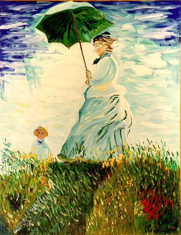 Frau mit Sonnenschirm (1875) 100x81 cm. Washington Gallery of art, Sammlung Mr. und Mrs. Paul Mellon. Das ReMiX ist 180x140 cm groß. Das Bild zeigt Madam Monet und ihren Sohn. Es gibt einige Monets die das Thema Familienmitglieder zeigt. Dieses ist für mich eines der schönsten. |