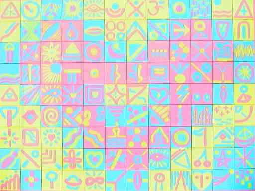 zu unserem Haus mit Strassenmalkreide bemalt. Die Motive waren sehr einfach. Das Ganze war damals schon mehr als seine Teile. Ich wollte eine Serie von Kacheln rausbringen die jeder beleibig zusammenstellen konnte. Als ich mit der Themensammlung anfing, ergab sich die Frage nach der Reihenfolge und ich entschied mich ein Motiv zu nehmen und die Basisfarbe des Hintergrundes auf 108 Kacheln gleichmäßig aufzuteilen. 36 in Cyan, 36 in Yellow und 36 in Magenta. Das ergab dieses Bild, daß in seiner Freude und Leuchtkraft wirklich einzigartig ist. Größe: 110x150 cm -Acryl auf Leinwand |